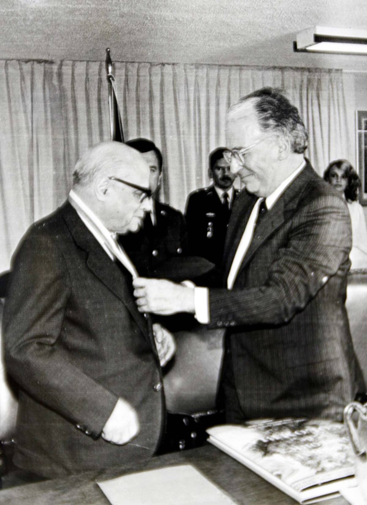 El ex presidente Carlos Lleras Restrepo es condecorado por el ex presidente Belisario Betancur