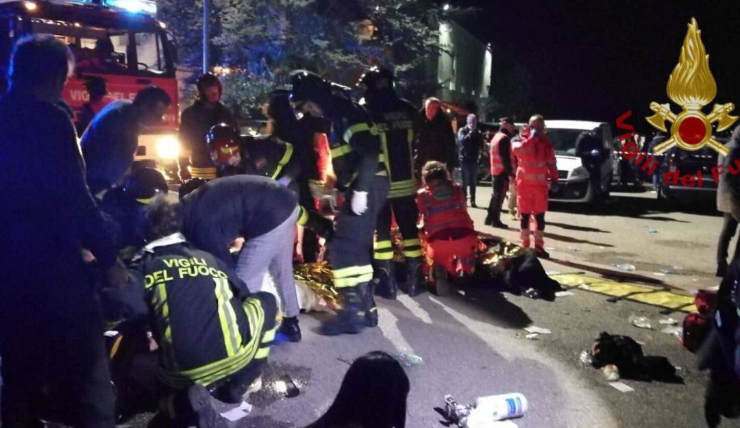 Según un mensaje de Twitter del cuerpo de Bomberos, la estampida se produjo antes de la 1.00 hora italiana (00.00 GMT) y en las imágenes difundidas por los bomberos se ve a decenas de jóvenes que están siendo atendidos en una carretera y algunos de ellos llevados en camillas.