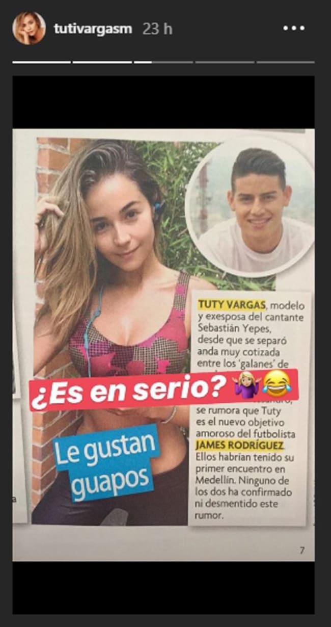 “Le gustan guapos. Tuty Vargas, modelo y exesposa del cantante Sebastián Yépes, desde que se separó anda cotizada entre los ‘galanes’ […] Se rumora que Tuty es el nuevo objetivo amoroso del futbolista, James Rodríguez. Ellos habían tenido su primer encuentro en Medellín. Ninguno de los dos ha confirmado ni desmentido este rumor”.