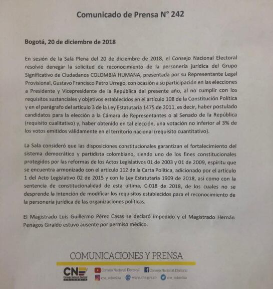 Los magistrados del Consejo Nacional Electoral tomaron la decisión de negar la personería jurídica a la Colombia Humana de Gustavo Petro por no reunir todos los requisitos de ley para otorgar dicho reconocimiento.