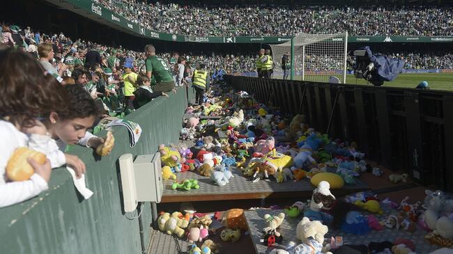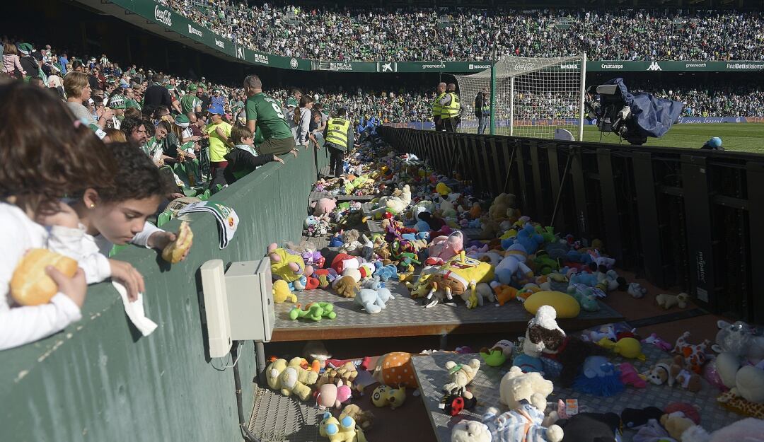 Una lluvia de peluches se vivió este sábado, en el estadio Benito Villamarín, durante el descanso entre Betis y Ebiar, partido que finalizó con una igualdad 1-1, por la Liga de España.