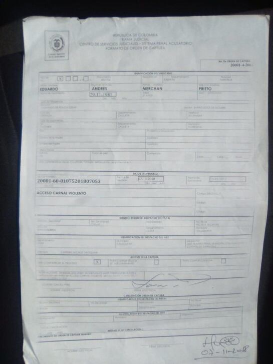 El capitán de la Policía Eduardo Merchán Prieto fue presentado ante un juez en la ciudad de Valledupar, por el presunto abuso sexual contra una de sus compañeras delito que no fue aceptado por el acusado.