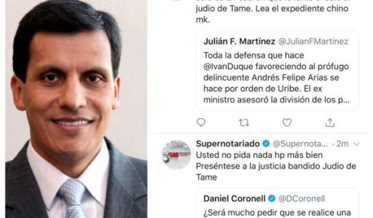 En uno de los trinos, se le decía de Julián Martínez, con groserías “periodista de 3 pesos” y a Daniel Coronell, de la misma manera, que se presentara ante la justicia. Martínez aceptó las disculpas, pero pidió investigar si tiene alguna relación con la creación de cuentas falsas, ya que la Superintendencia anunció una denuncia penal en la Fiscalía.