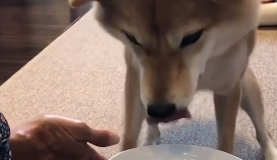 La mascota, que es de la raza akita recordada por el famoso perro japones Hachiko, espera con impaciencia, tanto que le da un manotazo a su dueño para poder empezar a comer.