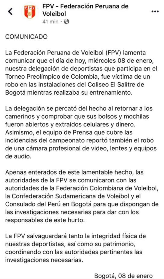 La Federación Peruana de Vóleibol fue víctima de un robo en las instalaciones del coliseo El Salitre, en la que les fueron despojados celulares, dinero, implementos tecnológicos, el hecho sucedió en medio del entrenamiento del equipo peruano en su previa al partido ante Colombia.