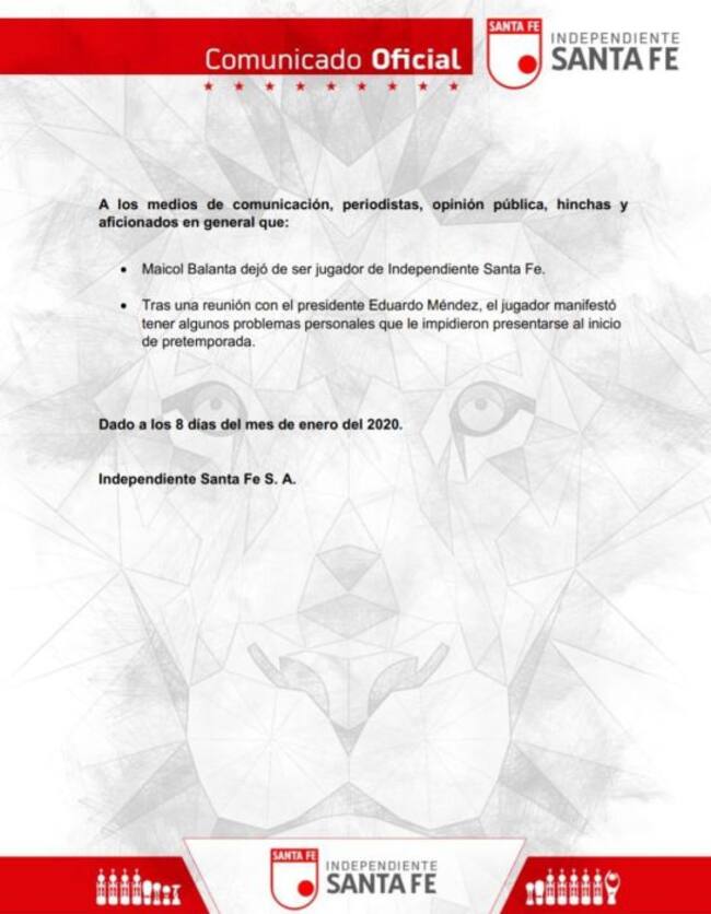 Presentarse tarde a la pretemporada con Independiente Santa Fe, fue la copa que rebasó el vaso de los dirigentes, que decidieron terminar el contrato de Maicol Balanta. Esto luego de que fuera citado el 2 de enero y apareciera en la sede administrativa del club 6 días después.