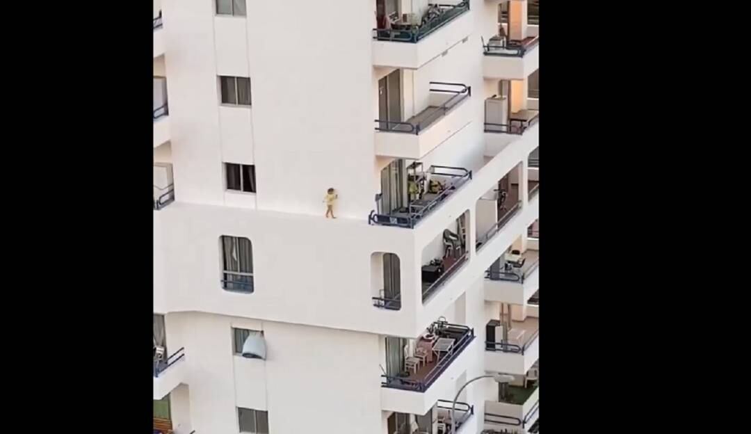 En video quedo el momento en que una niña sale por una ventana y empieza a jugar y correr por el borde de un edificio.