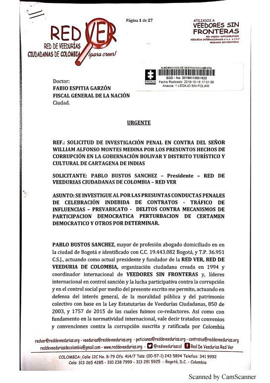En el documento allegado a la Fiscalía y a la Procuraduría acusa a la secretaría de Educación, Patricia Guerra de ser cuota política del exsenador parapolítico William Montes.