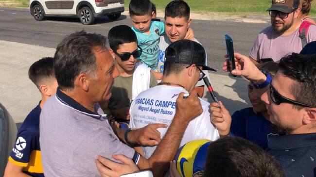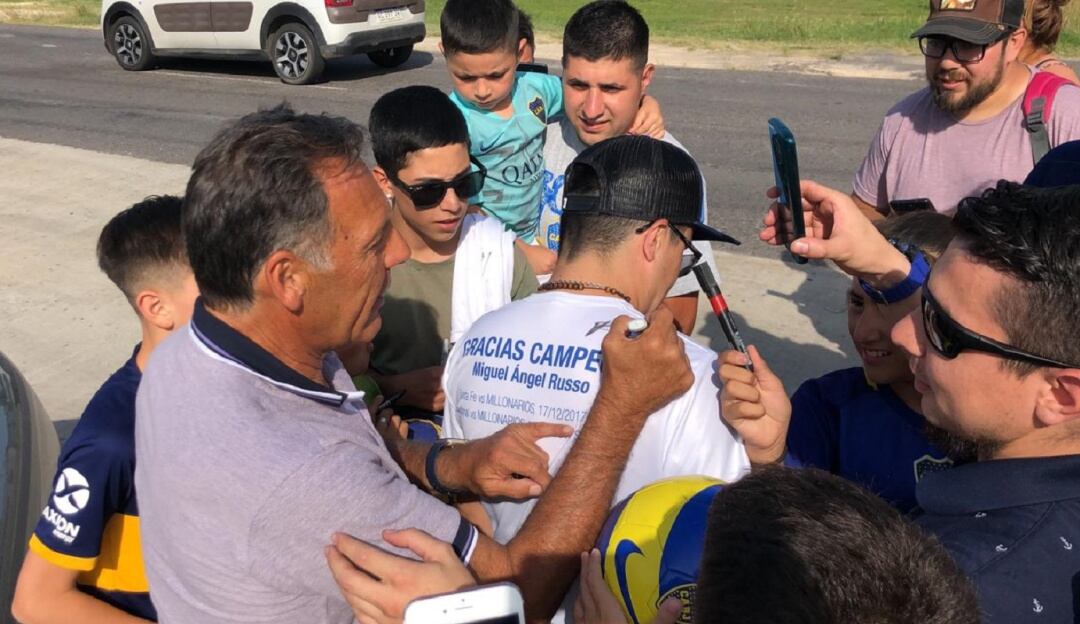 Juan Manuel, un bogotano hincha de Millonarios que vive en Argentina, visitó el entrenamiento de Boca Juniors con la esperanza de encontrarse a Miguel Ángel Russo, el nuevo técnico 'Xeneize' y recordado con emoción por su dos títulos durante su paso por el banquillo 'Embajador'. Con una camiseta conmemorativa, el aficionado logró su objetivo al finalizar la práctica.