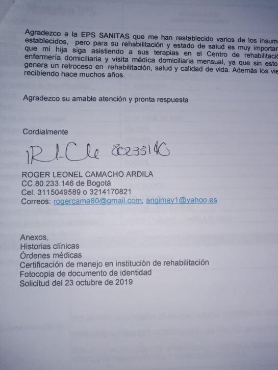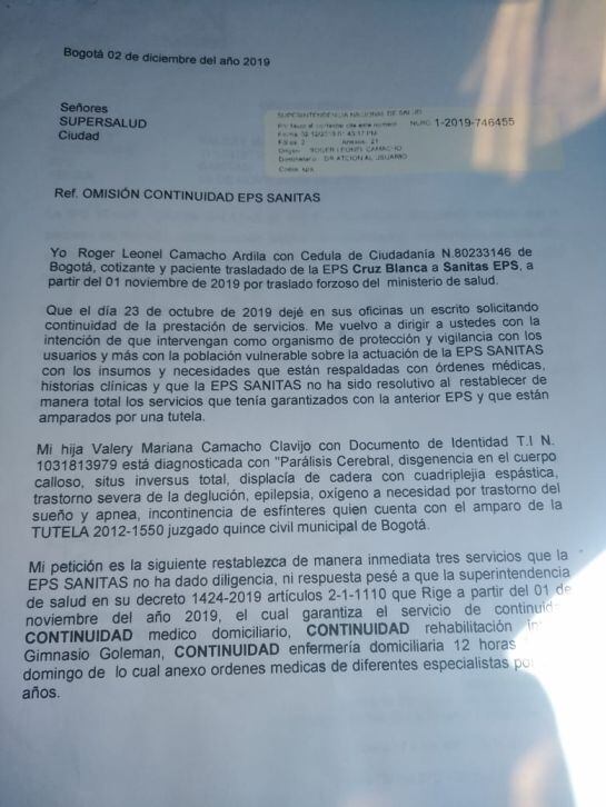 Valery Mariana Camacho es una paciente de 11 años totalmente dependiente, con diagnóstico de Disgenesia en el Cuerpo Calloso, es decir el puente o las líneas que unen los hemisferios cerebrales que normalmente son curvas ella las tiene lisas. Esto hace que la menor no se siente, no hable y no camine, además, que tenga hasta 8 convulsiones en una hora. Su padre Roger Camacho asegura que las terapias y servicio médico en casa que requiere la menor, la EPS Sanitas, no se los está garantizando.