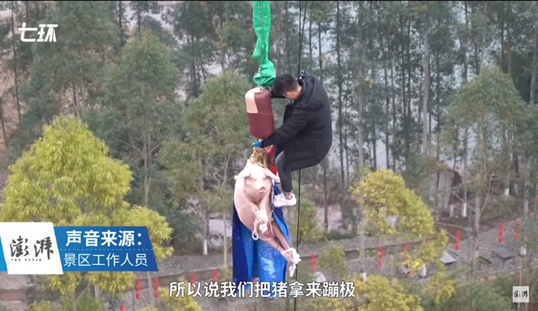 El cruel hecho se presentó al suroeste de China, en el parque de diversiones The Meixin Red Wine Town. Según explicaron sus directores, lanzar a un cerdo desde su nueva atracción de bungee jumping haría parte de la promoción de la misma.