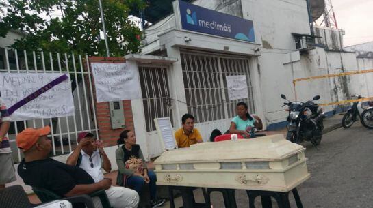 La mañana de este martes 21 de enero, diez pacientes en compañía de sus familiares determinaron echarles cadenas a las puertas de la empresa y no permitir el ingreso de sus trabajadores. Allí fue instalado un ataúd con una serie de pancartas donde le exigen a la empresa el cumplimiento y la prestación del servicio por el que pagan de manera puntual. “Ahí vamos a estar muy pronto en este ataúd sino se nos brinda el servicio, aseguró una usuaria”, al tener la iniciativa de colocar el féretro frente a las instalaciones de la empresa donde incluso fue cerrada la vía para cumplir el acto de velación de la empresa Medimás.