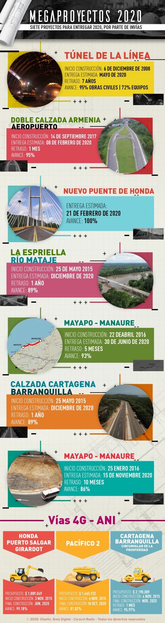Siete de estos proyectos están a cargo del Invías y tres a cargo de la Agencia Nacional de Infraestructura ANI. Los proyectos que corresponden a la ANI son 3 vías 4G. En el país hay actualmente 29 proyectos adjudicados de este tipo, que tienen un costo de obra de 45 billones de pesos.