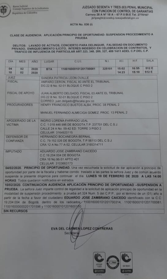 El juzgado 63 de garantías le dio el visto bueno al principio de oportunidad que la Fiscalía le concedió al empresario Eduardo Zambrano, es decir, un acuerdo de colaboración, con el que el empresario recibirá inmunidad penal por un año a cambio de que él entregue información sobre los dineros de Odebrecht que entraron a campañas políticas.