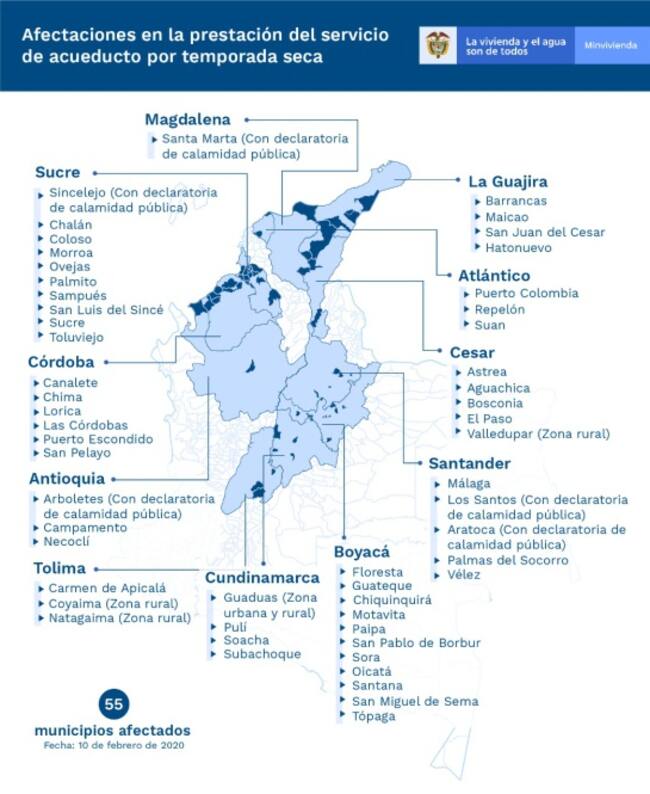 Esta semana se registró un aumento de ocho municipios más que presentan algún grado de afectación en sus sistemas por causa de la temporada seca, ubicados en los departamentos de Boyacá, Magdalena y Santander.