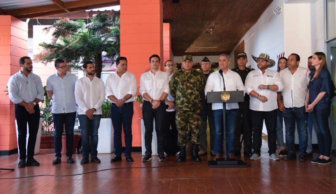 “Ellos tratan de intimidar con panfletos y comunicados, y aquí los estamos enfrentando con la contundencia de la fuerza pública”, dijo Duque.