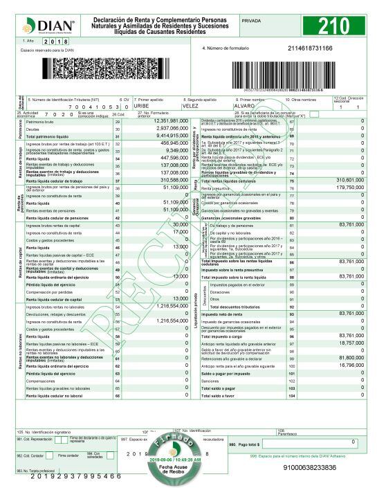 El de renta para 2018 sumó 83'761.000 pesos, pero durante ese año Uribe pagó retenciones por 81'800.000 pesos, a lo que se debe sumar el anticipo de renta para el año gravable siguiente, que fue de 16'796.000 pesos.
