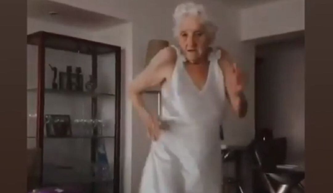 La abuelita, que usa un vestido blanco, arrasó las redes bailando el tema del cantante.