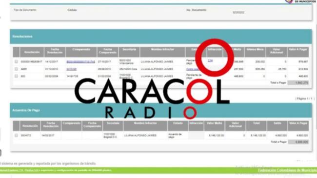 Caracol Radio verificó los sistemas de tránsito, en los que le figuran multas por pagar por valor de $6’672.295, divididos en multas vigentes por 1’992.275 y un acuerdo de pagó con tránsito por 4’680.020 en sanciones anteriores.