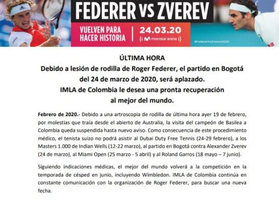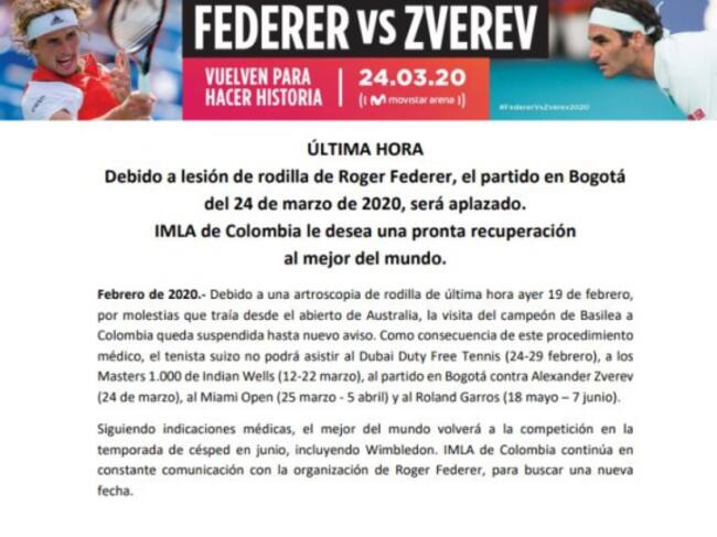 Roger Federer no se presentará en Bogotá el próximo 24 de marzo, el suizo fue sometido a una artroscopia por una molestia en la rodilla derecha y estará fuera de las canchas al menos tres meses, volviendo al circuito hasta la temporada de hierba.