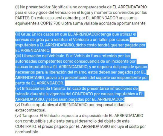 Si las autoridades se llevan para los patios el carro, el usuario (que se define en el contrato como arrendatario) deberá pagar todos los costos de sacar el vehículo de este lugar.