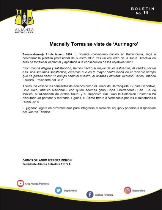 El volante colombiano, Macnelly Torres, vuelve al fútbol colombiano para vestir los colores de Alianza Petrolera. El club ya hizo la confirmación oficial a través de un comunicado, por lo que 'Mac' ponga su firma en el contrato por un año.
