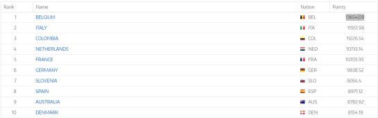 Sin embargo, Colombia sigue demostrando que es una potencia en el ciclismo mundial, y que se puede codear mano a mano con los mejores países del mundo. De hecho, en el escalafón supera a naciones tradicionales como Holanda (4.º), Francia (5.º), España (8.º) y Reino Unido (11.º).