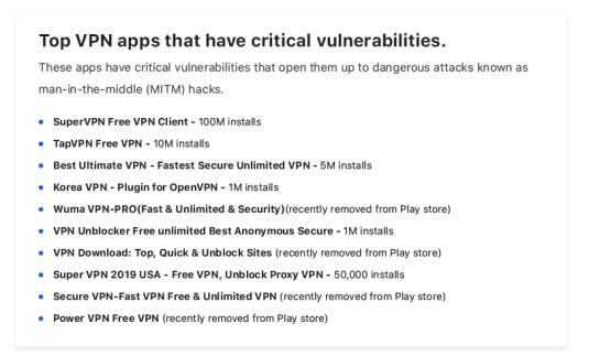 El portal especificó que, a pesar de haber sido descubiertos estos fallos en el 2019, de las diez aplicaciones, solo una tomó medidas ante las vulnerabilidades. Epertos de VPNpro recomiendan eliminar inmediatamente de los celulares las siguientes aplicaciones que comprometen su seguridad.
