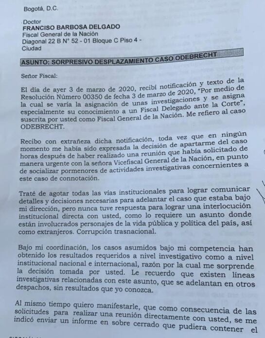 "Pero nunca tuve respuesta para lograr una interlocución institucional directa con usted, como lo requiere un asunto donde están involucrados personajes de la vida pública y política del país".