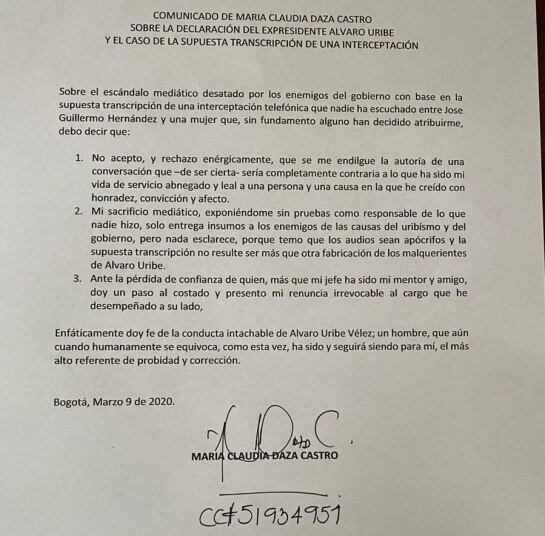 La renuncia se da después de que el ex presidente y senador Álvaro Uribe confirmará que María Claudia Daza, sería la mujer con la que hablaba José Guillermo Hernández conocido como “Ñeñe Hernández” y que en las interceptaciones es conocida como MD.