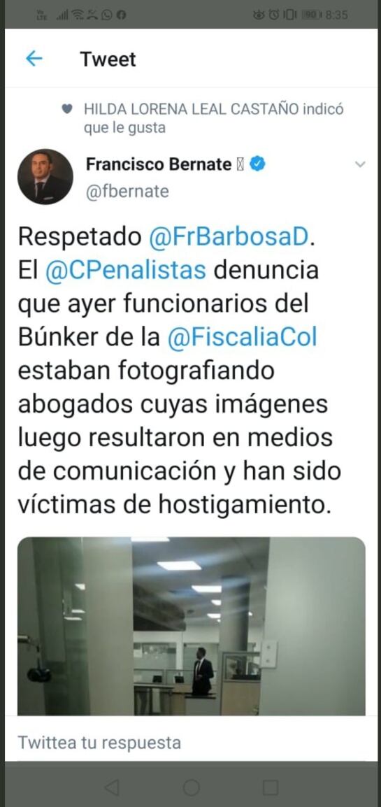"A nosotros nos parece llamativo que los únicos que no entramos a la Fiscalía con teléfonos a pesar de que es una herramienta de trabajo, somos los abogados...hemos pedido al fiscal General de la Nación que adelante una investigación para determinar quién tomó esa foto, por qué la filtró y sobretodo hacer un llamado de atención para que se proteja la vida es integridad personal de los abogados".