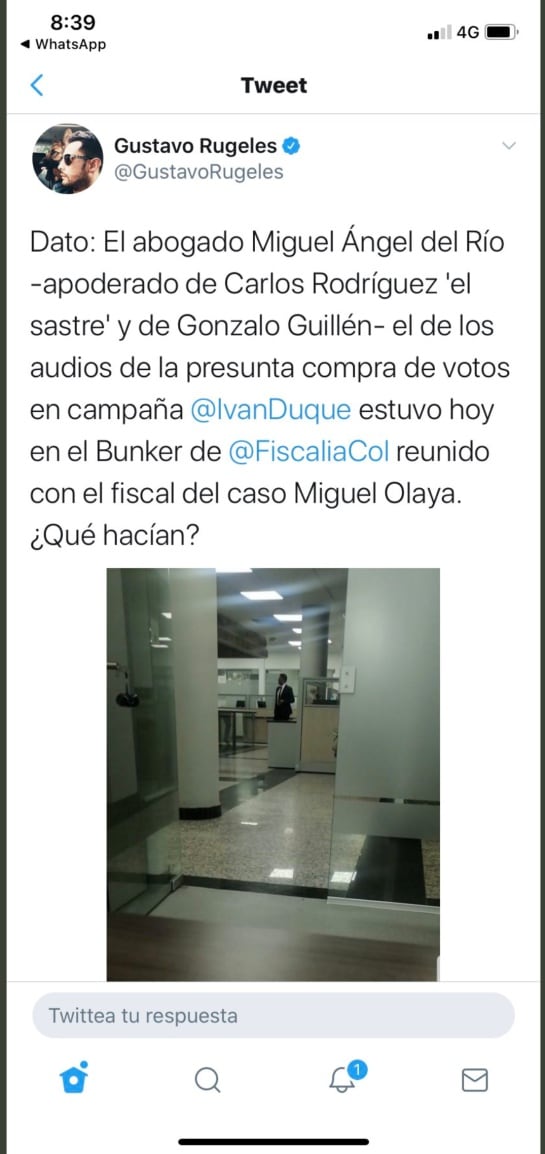 La petición de investigación se debe a que, en redes sociales de personas allegadas al Centro Democrático, fue publicada una foto del abogado Miguel Ángel del Río en las instalaciones del Búnker de la Fiscalía, en medio de una diligencia judicial.
