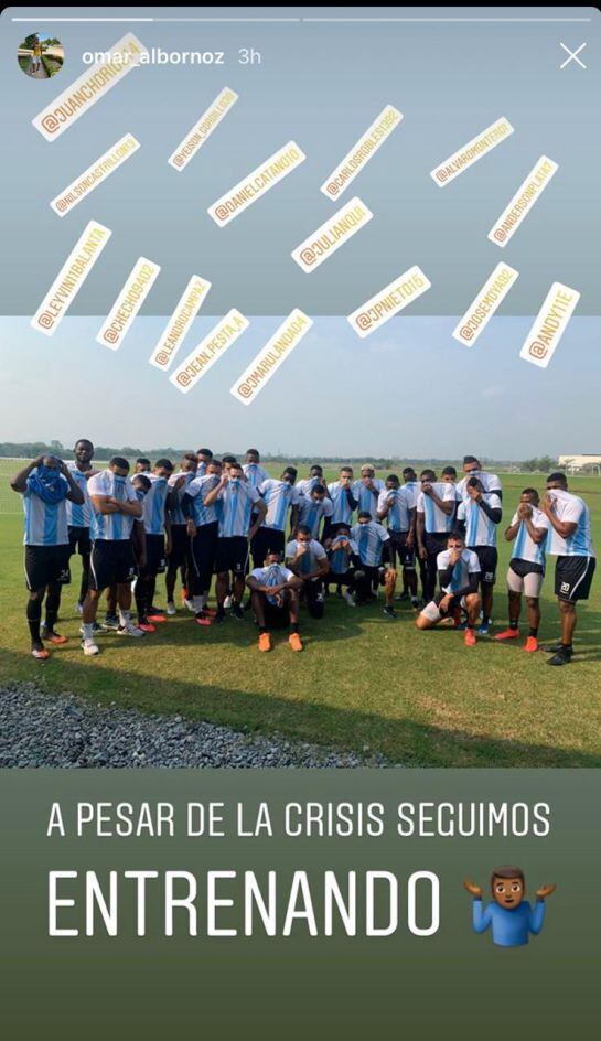 Hasta este martes Tolima venía entrenando con normalidad y, curiosamente, antes de que el club anunciara la cancelación de los entrenamientos, Omar Albornoz, volante del equipo, subió una foto a su Instagram con sus compañeros en la cual escribía: "A pesar de la crisis seguimos entrenando". En la imagen se puede observar al plantel cubriéndose la boca con las prendas de la práctica.