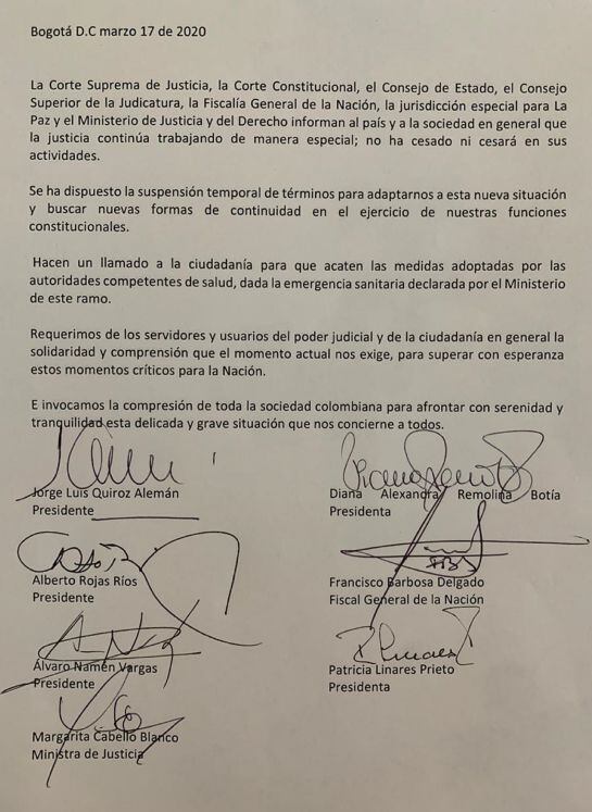 En un comunicado conjunto, la Corte Suprema de Justicia, la Corte Constitucional, el Consejo Superior de la judicatura, la Fiscalía General, la Justicia Especial para la Paz y el ministerio de Justicia hicieron un llamado a la ciudadanía para que se acaten las medidas adoptadas por las autoridades de salud, tras la emergencia que vive el país por cuenta del coronavirus.