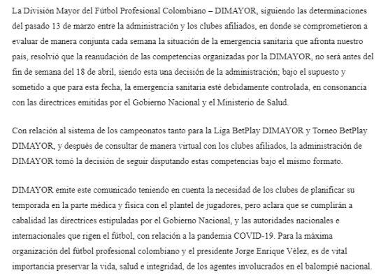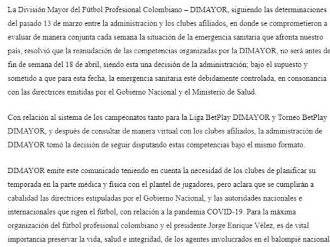 Según anunció el presidente de Atlético Nacional el torneo no comenzaría antes del 18 de abril.