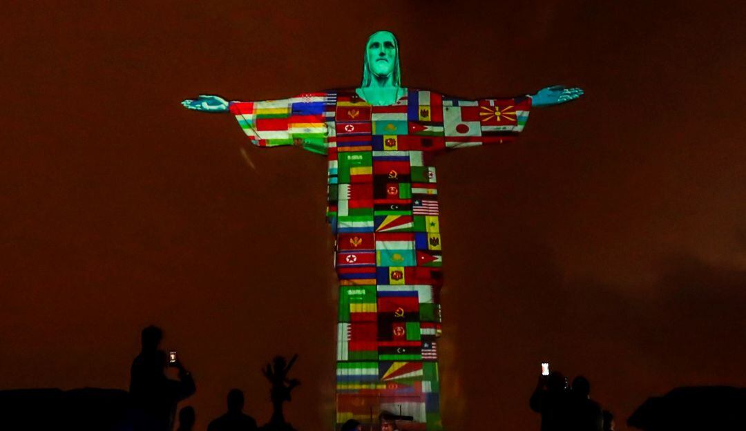 Las banderas de los 166 países en los que se han registrado casos de coronavirus fueron proyectadas este miércoles en un acto religioso sin público para orar por todos los enfermos en el Santuario del Cristo Redentor, la gigantesca estatua que corona el cerro del Corcovado en Río de Janeiro.