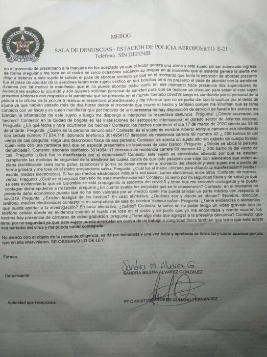 La mujer, una vez puso en conocimiento al personal de la aerolínea, estos solicitaron ayuda sanitaria para hacer chequeos y determinar si el agresor presenta síntomas de la pandemia.