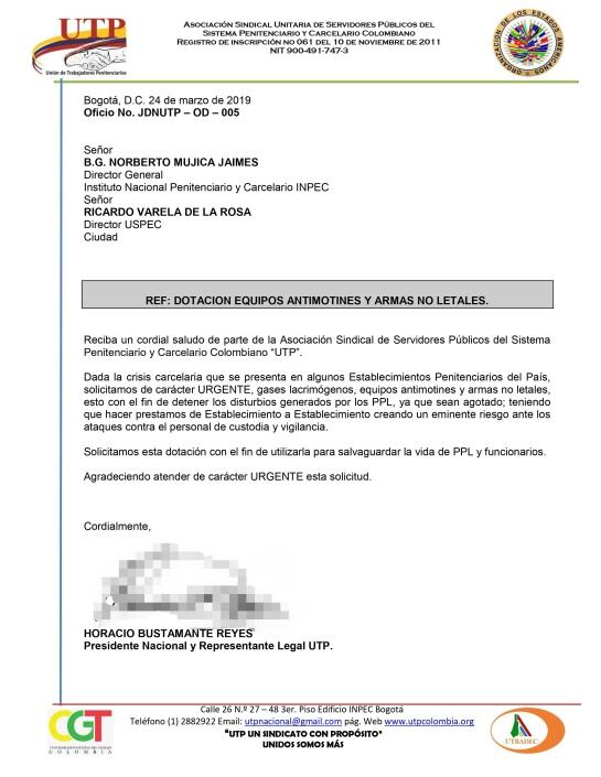 En el documento, los guardias del Inpec solicitaron como medida de protección al interior de los penales; chalecos blindados, gases, dotación y permiso de armas no letales.