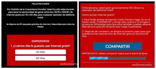 Si el usuario sigue los pasos de la campaña, el sistema lo obliga a compartir la “oferta” con sus contactos de WhatsApp para obtener el beneficio. Lo que da éxito a la viralidad del engaño.