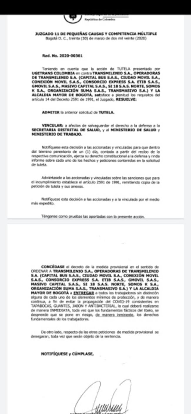 La decisión se debe a que un grupo de trabajadores de Transmilenio interpusieron una acción de tutela reclamando su derecho a la salud, puesto que al no tener las condiciones mínimas se exponían a la pandemia del coronavirus.