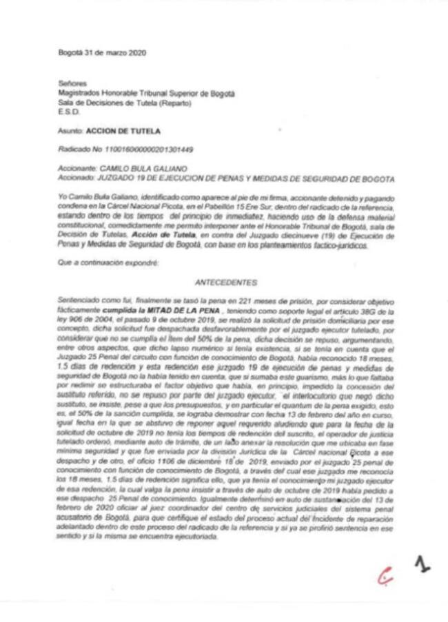 Bula es uno de los testigos estrella de la Fiscalía General dentro de los procesos penales que aún se adelantan por el desfalco a esa entidad, “Se está desconociendo el derecho de petición, el debido proceso y el acceso real a la administración de justicia, pues no decidir de fondo lo propuesto en el memorial que solicita la prisión domiciliaria, es obstaculizar el acceso a ese mecanismo sobre esta institución” dice el documento.