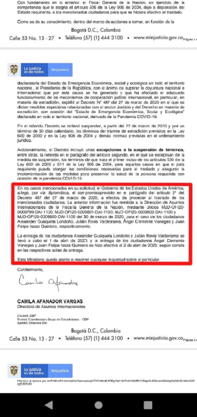 Un oficio del Ministerio de Justicia, confirmó que los cinco reclusos fueron extraditados a Estados Unidos entre el 1 y 2 de abril porque el gobierno de ese país, vía diplomática, envió un compromiso por escrito en el que dice garantizar las condiciones para preservar la salud de los reclusos requeridos. (ver documento)