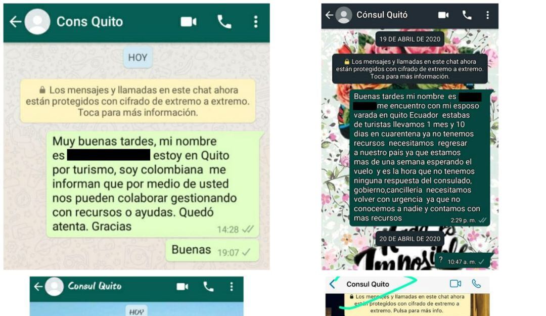 Lo propio señaló Mayerli Cárdenas, quien le escribió hoy 22 de abril. "Venimos pidiendo información a los consulados desde hace mucho y recibimos informaciones evasivas o ni siquiera responden. Le escribí para preguntarle cuándo estarían podrían autorizarse los vuelos humanitarios o los corredores viales. Lo hice a las 2:07 de la tarde, y las 2:19 me doy cuenta de que me ha bloqueado. Es bastante delicado porque se supone que ellos son los encargados de apoyarnos en Ecuador".