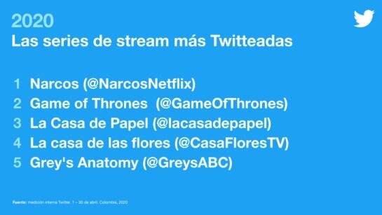 Pero, ¿qué hay sobre los servicios de stream? En Colombia nos encanta hacer maratones y presumir cuando ya vimos completa la serie del momento. Estas son las series más Twitteadas: