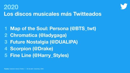 Por esto, @TwitterLatAM se puso a la tarea de realizar una medición interna entre el 01 y el 30 de abril para dar a conocer a los fanáticos de la música y el entretenimiento cuáles son los discos musicales, los artistas y aquellas producciones de TV que se han robado su corazón. ¡Conócelos a continuación!