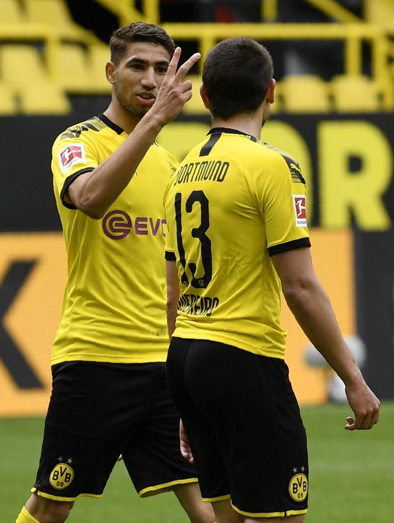 Raphaël Guerreiro junto a Hakimi durante el cuarto gol del Dortmund.