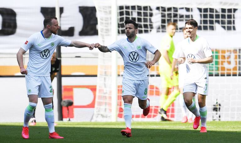 Renato Steffen anota el primer gol del Wolfsburgo ante el Augsburgo y choca los puños con Maximilian Arnold.
