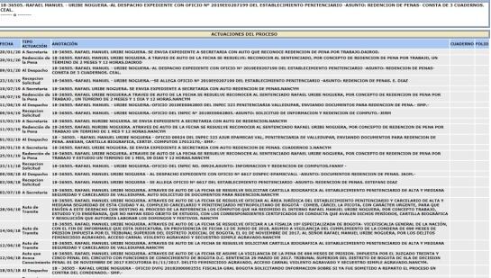 En la página de la rama judicial, aparece que la redención de la pena por dos meses, un día y 12 horas que le otorgó el juzgado tercero de ejecución de penas por trabajo y estudio en la prisión, se produjo a mediados de 2019, per so solo hasta hace unas horas se supo de la existencia de ese beneficio.