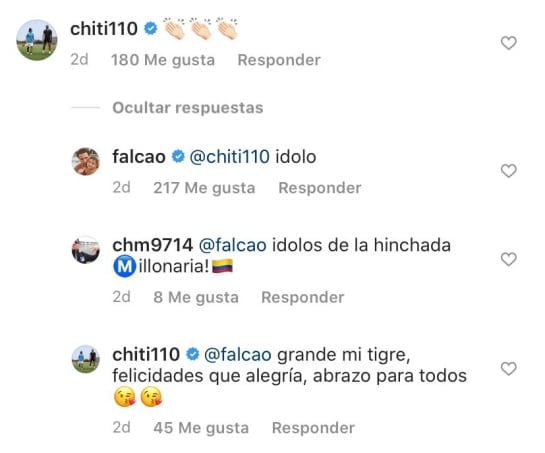 Andrés Chitiva, exjugador de Millonarios y con un importante paso por el fútbol mexicano, especialmente en el Pachuca, publicó unos aplausos a la foto del goleador histórico de la Selección Colombia, a lo que el samario respondió con con un contundente "ídolo".