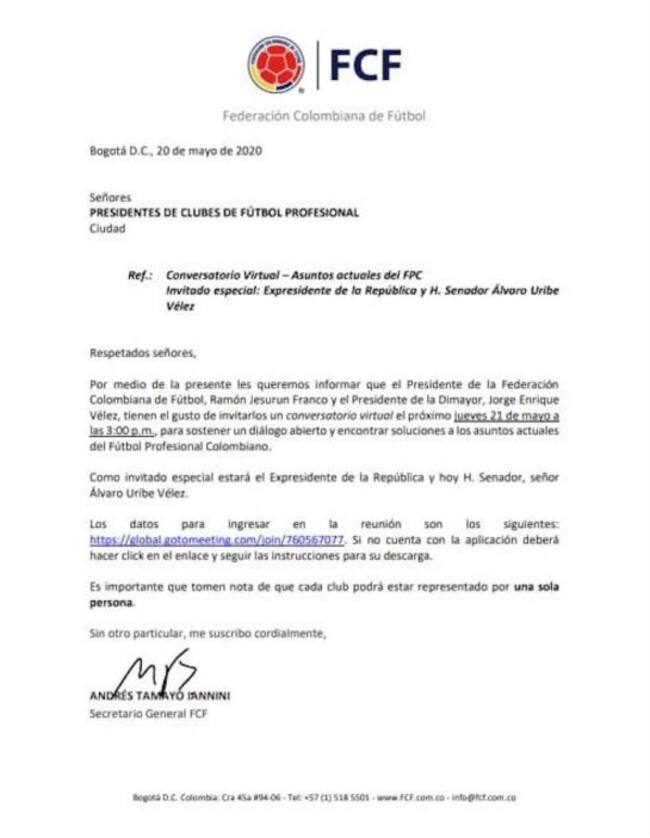 Este jueves la Federación Colombiana de Fútbol (FCF) y Dimayor citaron a varios presidentes de los clubes en el fútbol colombiano para sostener un conversatorio sobre la reanudación del balompié nacional en medio de la pandemia de la COVID-19. En el encuentro virtual también estuvo presente el expresidente y hoy senador del Centro Democrátivo, Álvaro Uribe Vélez.